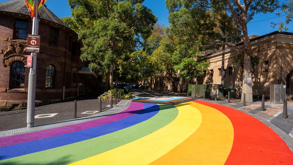 The freshly painted roadway joins a Progress Pride crossing between Bourke and Campbell streets at Taylor Square and a 90m Progress Pride footpath in Prince Alfred Park in Surry Hills.